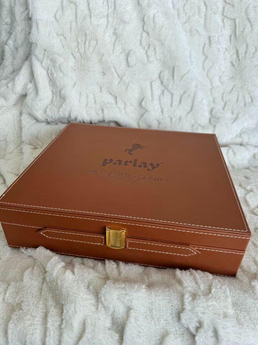 Wrapped in a sophisticated saddle brown vegan leather complete with ivory stitching and gold hardware, the Parlay Deluxe Edition is a family friendly game and a statement piece ready to elevate any room in your home.